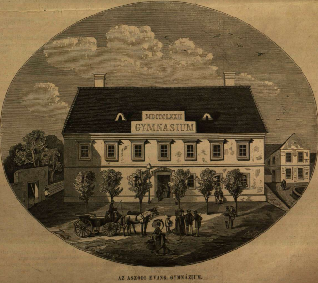 A képeken a két aszódi kastély látható, az U-alakú a korábban épült Podmaniczky-kastély, mellette a Széchenyi -kastély, valamint a latin iskola.